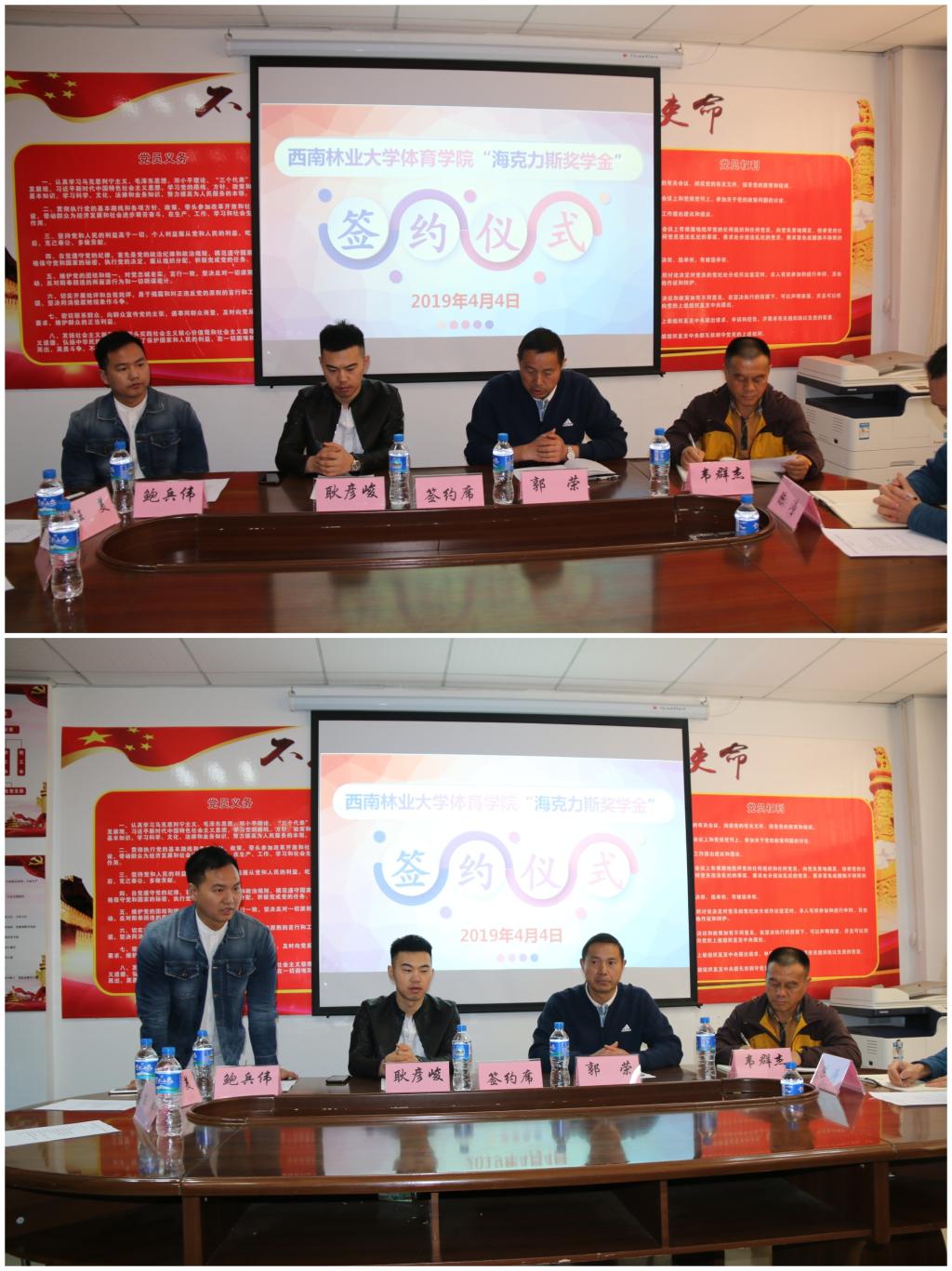 2019年4月4日上午11:40,2026年国际足联世界杯与云南海克力斯健身服务有限公司在体育馆南门112会议室举行“海克力斯奖学金”签约仪式。云南海克力斯健身服务有限公司董事长耿彦峻、副总经理鲍兵伟、董事长助理邵帅、人事经理汪美以及2026年国际足联世界杯郭荣书记、韦群杰经理、陈涛副书记、各科室负责人、行政坐班人员、各班班长、团支书参加本次签约仪式。