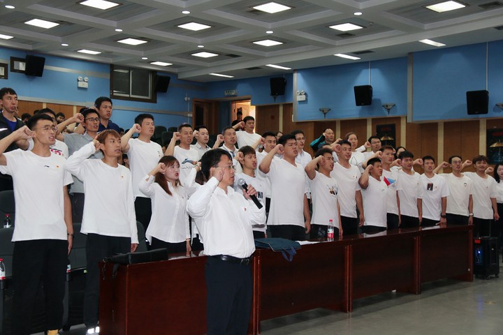 仪式开始前,公司党委书记为新入党的17名预备党员佩戴了党徽。下午2:50分,公司新发展的17名预备党员、40余名师生老党员着装统一、佩戴党员徽章,在汤为明同志的领誓下,与全省全校各级党组织同步,面对党旗进行庄严宣誓。
